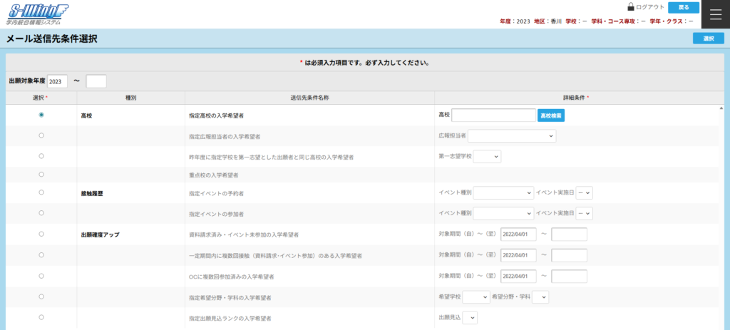 - 柔軟な抽出条件: 「指定高校の生徒」「資料請求済みだがイベント未参加」など、出願確度や接触履歴に応じたピンポイントな配信が可能です。